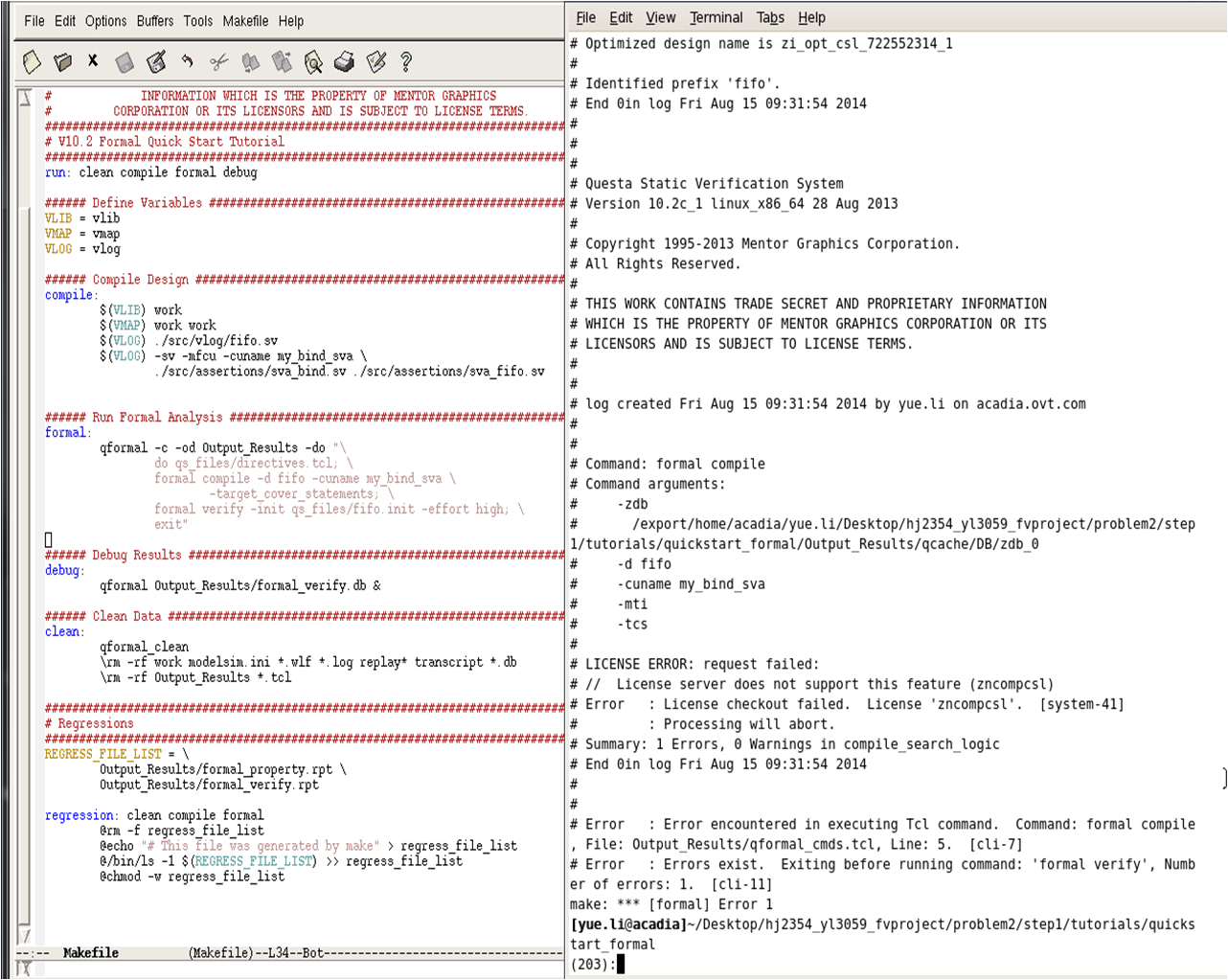 I have a licence problem but don’t know. When I type in command “qformal”, it could run the simulation normally. But when I run my makefile, it reminds me the errors as the following picture shows. If any licence is missing, I will contact the IT of my company to install it.