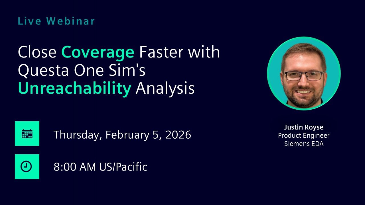This seminar discusses technologies and techniques you can adopt to increase your verification productivity. We will cover how the new AI/ML paradigm shift across the industry is enabling functional verification productivity gains with Questa One across the verification cycle including RTL creation, simulation, coverage closure, system-level verification and through DFT simulations. Thursday, February 19, 2026 | 9:30 AM - 5:15 PM Location Topgolf 2700 Esperanza Crossing Austin, Texas 78758